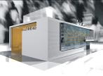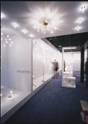 Linee tese, spazi filanti, volumi scultorei tagliati, fessure e superfici vetrate danno vita a giochi infiniti di scorci e riflessi. Tutto parte da una pianta semplicissima -un "recinto"- che però si esplicita in una tridimensionalità estremamente articolata. il "concetto" architettonico -l'idea- si incentra sulle due facciate principali, "segnate" da uno sfalsamento dei piani verticali quasi disorientante, accentuato ancor di più dal continuo sovrapporsi di quinte, lastre, immagini, scritte, tagli… Un linguaggio secco, rigoroso, "architettonico" che entra anche all'interno, traducendosi in una esasperata monocromia: è il prodotto ad essere l'elemento immediatamente riconoscibile. La PROVVISORIETA' tipica dell'allestimento si incontra-scontra con la solidità, le forme e l'"IMMORTALITA'" delle linee architettoniche |